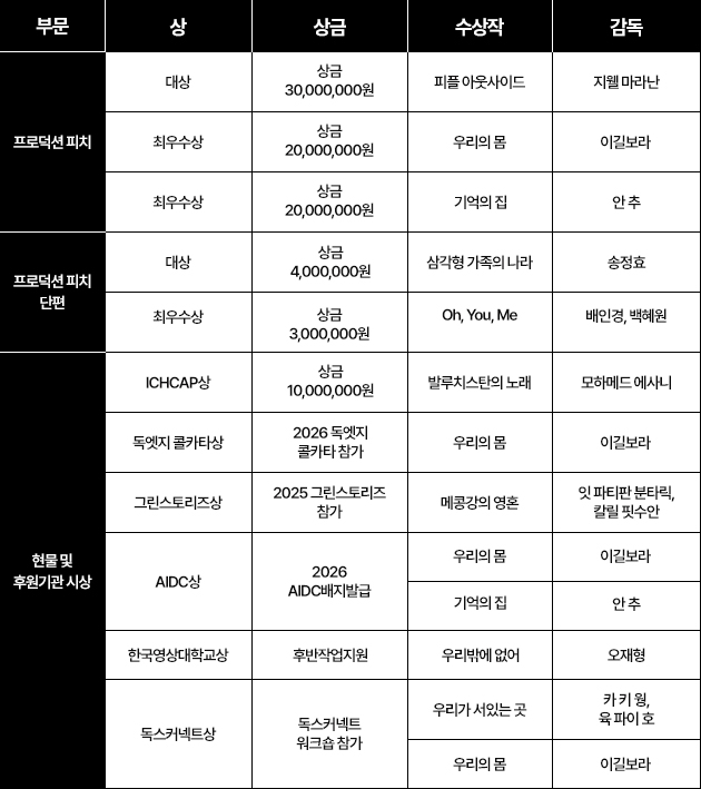 지난 9월 14일에 열린 2025 DMZ Docs 인더스트리 어워즈의 주요 수상작은 아래와 같다. 프로덕션 피치 대상은 <피플 아웃사이드>(지웰 마라난)가, 최우수상은 <우리의 몸>(이길보라), <기억의 집>(안 추)이 선정되었다. 피치 단편 대상은 <삼각형 가족의 나라>(송정효), 최우수상은 <Oh, You, Me>(배인경, 백혜원)가 수상했다. 이 외 프로덕션 피치, 프로덕션 피치 단편 선정작 모두 우수상으로 선정되었다.