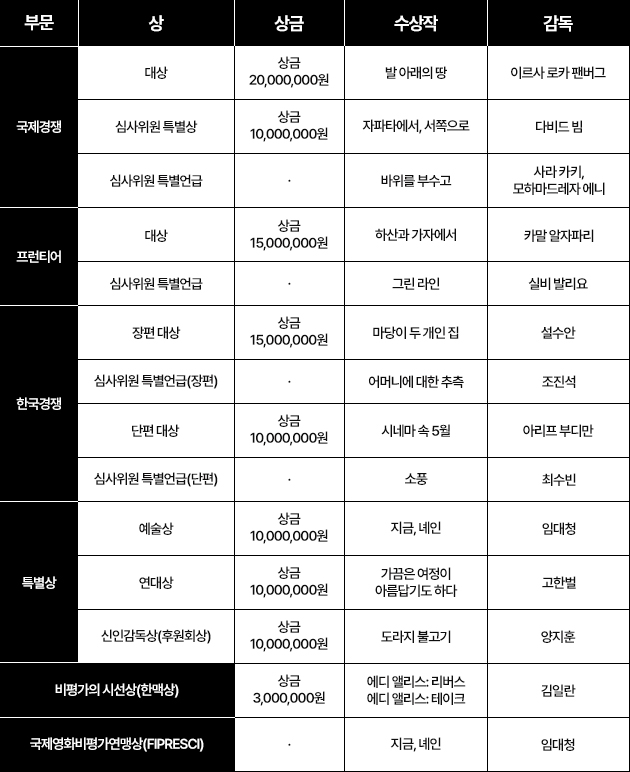한국경쟁 부문은 장편과 단편으로 나누어 각각 대상을 수여했다. 장편 대상은 설수안 감독의 <마당이 두 개인 집>으로 선정되어 상금 1천5백만 원을 수여했다. <마당이 두 개인 집>은 도시 화분에서 자란 상추씨를 통해, 한 할머니의 삶과 손길, 그리고 세상의 많은 할머니들이 남긴 따뜻한 흔적을 되새기는 이야기다. 심사위원단은 “만장일치로 한국경쟁 장편 대상으로 한 편의 영화를 선정했다”고 밝히며 “마치 농사처럼 이 영화의 경이로운 단순함은 끈질긴 노동과 깊은 몰입, 사려 깊은 성찰이 빚어낸 값진 결실”이라고 평했다. 조진석 감독의 <어머니에 대한 추측>는 한국경쟁 장편 부문에서 특별언급됐다.