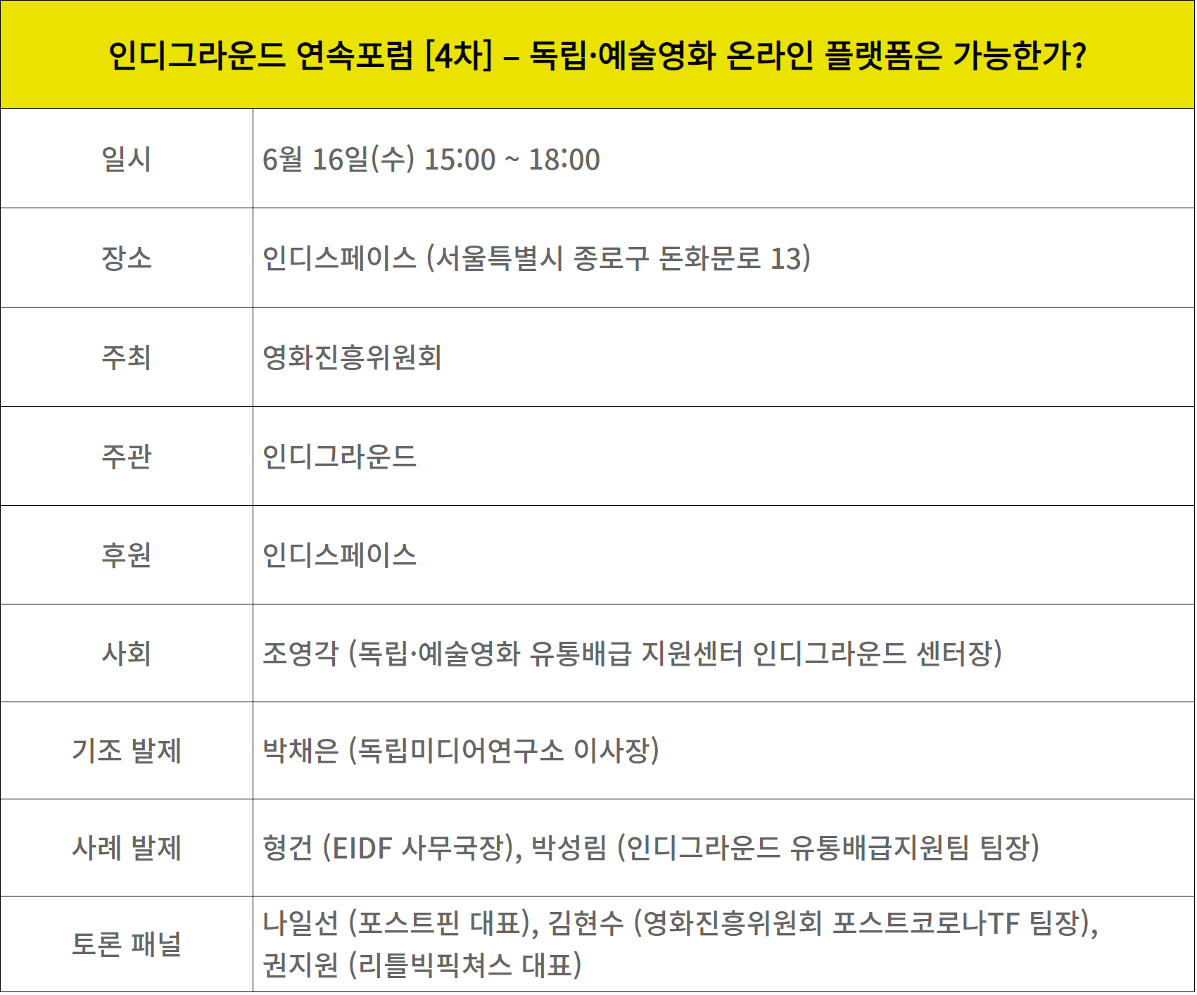 4차 포럼(6월 16일(수) 오후 3시)은 ‘독립·예술영화 온라인 플랫폼은 가능한가?’라는 주제로 진행된다. 독립영화 온라인 플랫폼의 다양한 실험과 전략을 공유하고, 플랫폼의 지속가능성을 탐구해보는 자리를 마련한다. 인디그라운드 조영각 센터장이 사회를 맡으며 독립미디어연구소 박채은 이사장이 기조 발제를, 다큐멘터리 전용 스트리밍 서비스 D-BOX를 운영하고 있는 EIDF의 형건 사무국장과 지난해 온라인 플랫폼을 오픈한 인디그라운드의 유통배급지원팀 박성림 팀장이 사례 발제를 진행한다. 토론 패널로는 포스트핀 나일선 대표, 영화진흥위원회 포스트코로나TF팀 김현수 팀장, 리틀빅픽쳐스 권지원 대표가 함께한다.