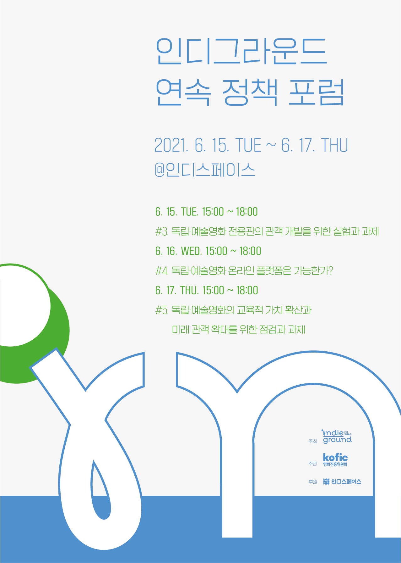 | 인디그라운드의 3, 4, 5차 연속 정책 포럼은 독립영화전용관 인디스페이스에서 6월 15일(화), 16일(수), 17일(목) 3일에 걸쳐 진행된다. 3차 포럼(6월 15일(화) 오후 3시)의 주제는 ‘독립·예술영화 전용관의 관객 개발을 위한 실험과 과제’이며, 26개의 독립·예술영화 전용관이 함께 참여했던 인디그라운드의 인디플렉스 캠페인 결과 보고와 독립·예술영화 전용관의 브랜딩 대표 사례를 공유하는 시간을 가진다. 사회는 커뮤니티시네마네트워크 사회적협동조합 권현준 이사장이 맡으며, 인디그라운드 네트워크팀 오보라 팀장의 기조 발제와 인디스페이스 기획운영팀 김도란 팀장, 아트나인 극장사업부 박혜진 팀장, 인천미림극장 최현준 대표의 사례 발제가 이어진다. 토론 패널로는 영화사 진진 장선영 부장, 시네마라운지MM 정성우 대표, 영화진흥위원회 독립·예술영화팀 이지현 주임이 참여한다.